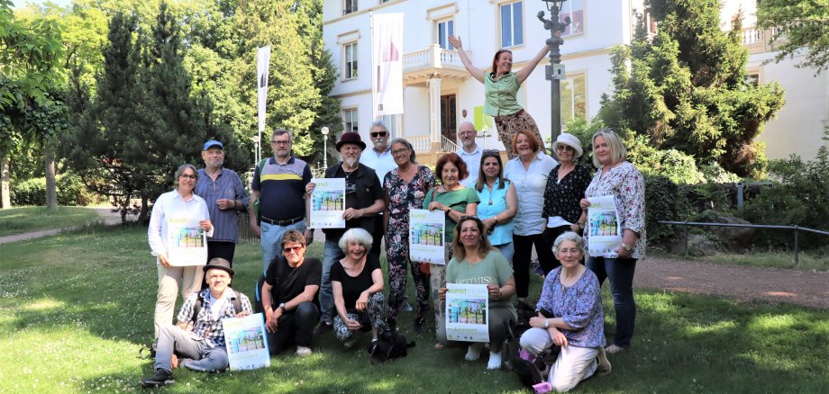 Foto: Freuen sich auf den 3. Juli: die teilnehmenden Künstlerinnen und Künstler und Akteure des Kunstmarkts präsentieren mit Kulturamtsleiterin Grit Gigga (vierte von rechts) und Kulturamtsmitarbeiterin Anja Gillmann (erste von rechts) im Schlosspark das Veranstaltungsplakat.