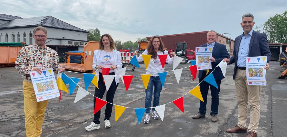 Nath übergab die Wimpelketten zusammen mit Iris Prencipe und Manuela Gilles (beide Wir sind Kreuznach) sowie Thorsten Ackermann (Sparkasse Rhein-Nahe) an Bürgermeister Thomas Blechschmidt. In fleißiger Handarbeit brachten Mitarbeitende des Bauhofes und der Unternehmensgruppe Kreuznacher Stadtwerke gemeinsam die Wimpelketten an den Leinen in der Innenstadt an.
