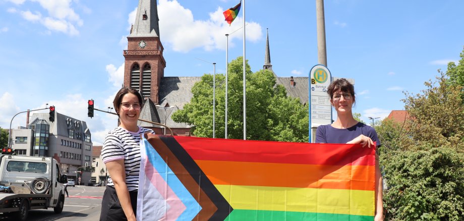 Großes Foto: Laura Schäfer (links) und Danielle Schulz, Mitarbeiterinnen des Jugend- und Kooperationszentrums „Die Mühle“ und Organisatorinnen des QueerTreffs Bad Kreuznach, freuen sich über die gehisste Pride Flag zum Internationalen Tag gegen Homo-, Bi-, Inter- und Transphobie (IDAHOBIT) am Europaplatz.