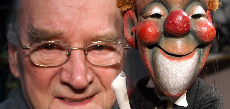 Foto: Der Marionettenspieler Albrecht Roser mit Clown Gustaf, © Ingrid Höfer