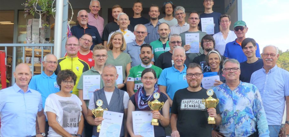 Foto: Die drei „Pokalträger“ Alex Groehl, Johanna Reitze und Oliver Walter (v.l.) mit den Nächstplatzierten, sowie mit Sportdezernent Markus Schlosser (vorne links), Organisator Thomas Fischer (vorne rechts) und Sponsor Andreas Rapp (hinten links).