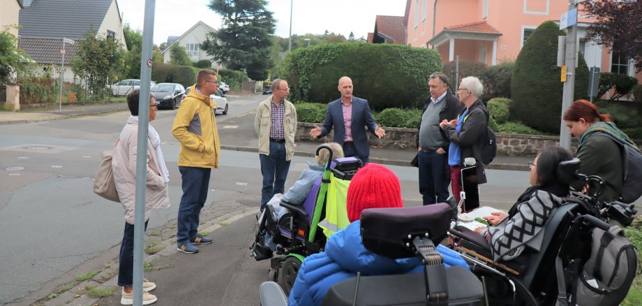 Großes Foto: Sozialdezernent Markus Schlosser machte sich mit Mitarbeitern der Abteilung Verkehrsangelegenheiten und der Abteilung Tiefbau und Grünflächen sowie Mitgliedern des Behindertenbeirats ein Bild von den verschiedenen Problemstellen (hier: Kreuzung Bösgrunder und Neufelder Weg) in der Stadt.
