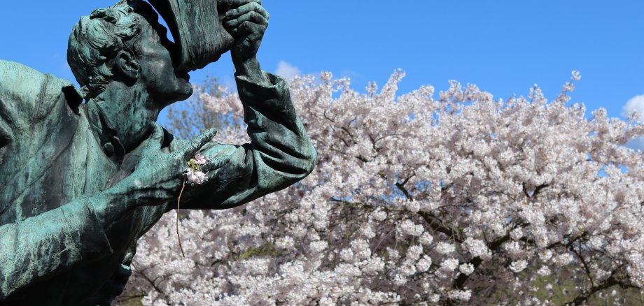Foto ganz oben: Den Kampf ums Wasser, in der Klimakrise hochaktuell, symbolisiert die "Durstgruppe", von Bildhauer Ludwig Cauer (1866-1947) geschaffen. Hier aber hat ein Spaziergänger dem Soldaten eine Kirschblüte in die Hand gelegt.