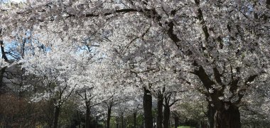 Dann folgt die Zeit der Kirschblüte in der Kirschsteinanlage, benannt nach dem Bürgermeister Kirschstein (Amtszeit von 1897 bis 1909). In einem reinen Weiß bilden die Blüten der heimischen Vogelkirche ein dichtes Dach. Wiederum etwas später (etwa Ende April) beginnt die Blüte der Kirschen in der Cauerstraße. Hier färbt die Zierkirsche der Sorte ‚Kanzan‘ mit ihren Blütenbüscheln die Straße in eine dunkelpurpurrosa Farbe.