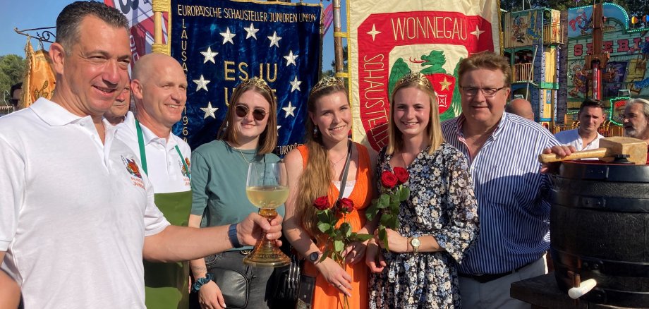 Auch die Naheweinmajestäten Christina Schwarz, Johanna Lorenz und Tina Anheuser nahmen am Umzug über die Pfingstwiese teil. Die Festgäste versammelten sich um den Klassiker des Jahrmarkts, den Wellenflug, und zogen anschließend feierlich zum Naheweinzelt.