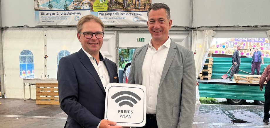Foto: Christoph Nath, Stadtwerke-Geschäftsführer, und Oberbürgermeister Emanuel Letz im Weinzelt, in dem die Stadtwerke das WLAN zur Verfügung stellen. Foto: Kübra Gökbay