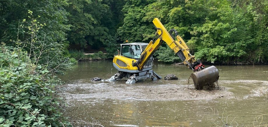 Foto: Ein Schreitbagger baggert den Schlamm des Schlossparkweihers aus.
