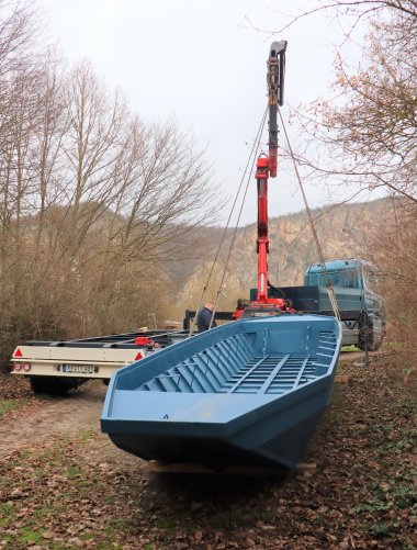 Im Anschluss wurde das rund zwei Tonnen schwere Boot durch eine Bad Kreuznacher Spedition zu einer Halle bei der Kläranlage in Ebernburg gebracht. Dort wird Fährmann Hans-Joachim Gellweiler in den nächsten Wochen noch ausstehende Holzarbeiten in Eigenleistung erledigen. Die Materialkosten für die Sitzbänke, Tische und Aufbauten übernimmt die Stadt Bad Kreuznach.