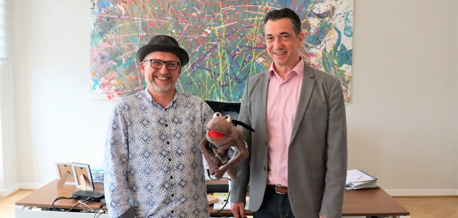 Foto: OB Emanuel Letz und Adrian Kroll von der Stadtjugendförderung werben mit dem Maskottchen des Kinderdorfs, der Ameise, für das Angebot in den Sommerferien. Im Hintergrund: das Bild, das Kinder im Kinderdorf 2022 fertigten.