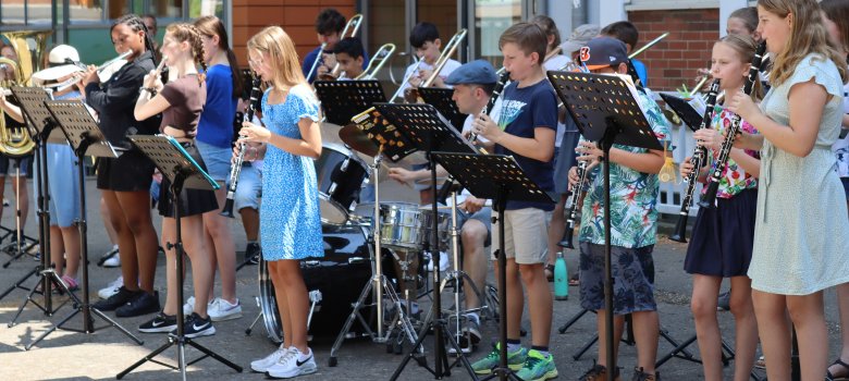 Das Lina-Hilger-Gymnasium (Schüler der 12. Klassen und die Caféteria) sorgte vor den Startphasen für die Verpflegung und für einen musikalischen Beitrag der Bläserklasse 5 b unter der Leitung von Johannes Lind (Foto). Die Gruppe „Quintonics“ (vier von fünf Badmitgliedern besuchen das LiHi) bekam für ihren selbst getexteten und komponierten Anti-Müll-Song für die Bad Kreuznacher Kampagne „Botschafter für eine Saubere Stadt“ wieder viel Beifall.