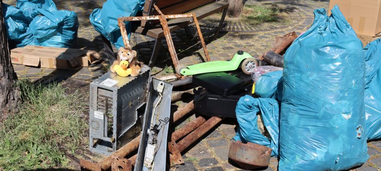 Auch Oberbürgermeister Emanuel Letz, Bürgermeister Thomas Blechschmidt und Beigeordneter Markus Schlosser zogen die Arbeitshandschuhe an, schnappten sich Greifzangen und Müllsäcke und machten mit. Am Ende transportierten Georg „bürgerfreundlich“ Bürger und seine Mannschaft vom Bauhof fünf volle 1100 Liter Container Müll sowie diverse Möbel, Elektroschott und Metalle.