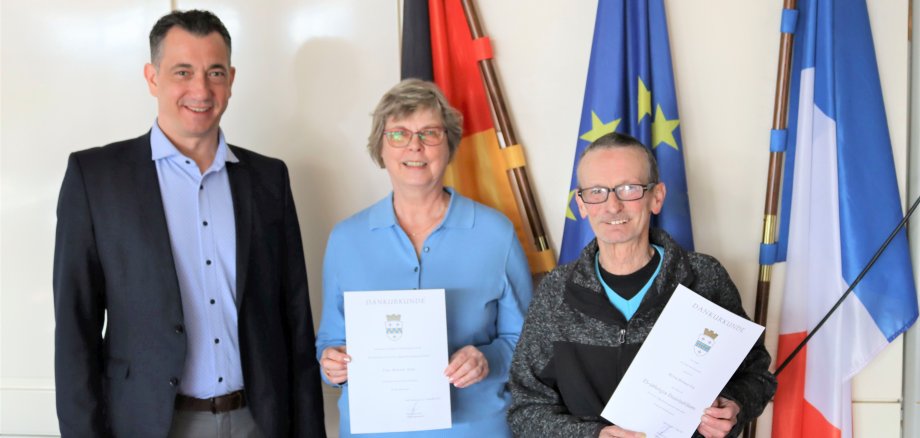 Foto: Verabschiedung und Dienstjubiläum in einer kleinen Feierstunde. Oberbürgermeister Emanuel Letz bedankte sich bei Bettina Nebe und Helmut Fey.