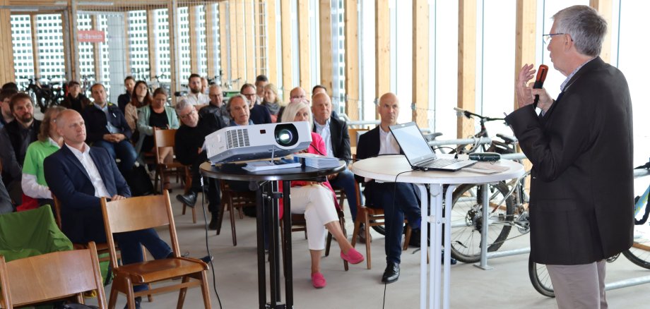 Foto. Ein Grußwort sprach Staatssekretär Dr. Erwin Manz bei der Infoveranstaltung im Fahrradparkhaus am Bahnhof Bad Kreuznach.