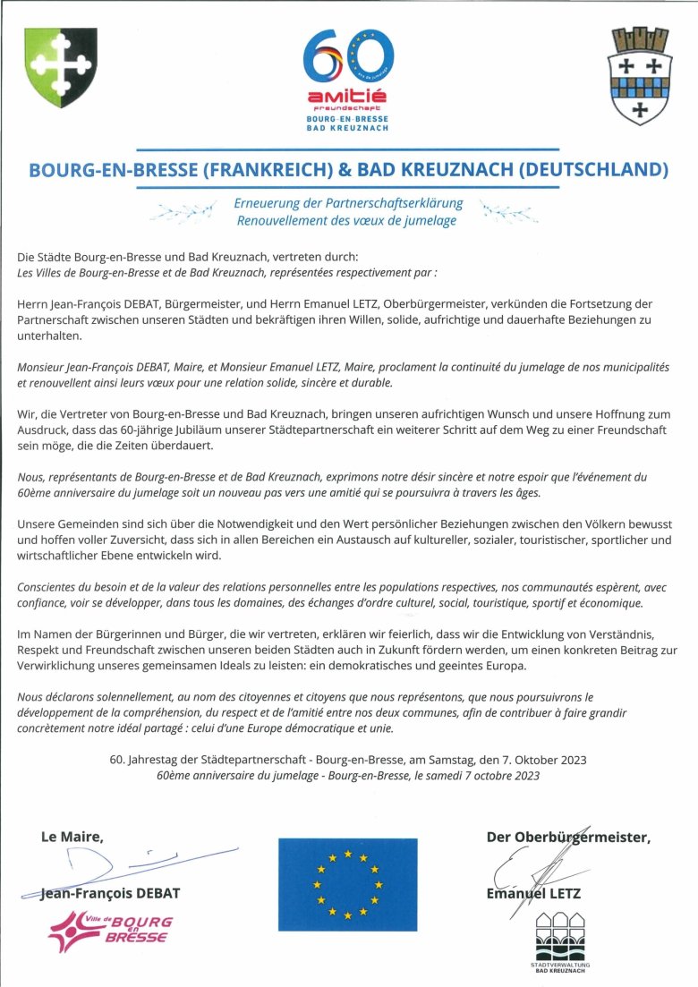 Für die Geschäftsleitung der Verwaltung, Nathalie Herberger, war es die erste Reise nach Bourg-en-Bresse in ihrer Funktion: „Wir hatten ein tolles und kulturell vielfältiges Programm, das von der gesamten Delegation aus Bad Kreuznach gewürdigt worden ist. Ich freue mich auf eine Intensivierung der Städtepartnerschaft und werde innerhalb der Stadtverwaltung unsere deutsch-französische Partnerschaft auf Arbeitsebene gerne weiter ausbauen.“