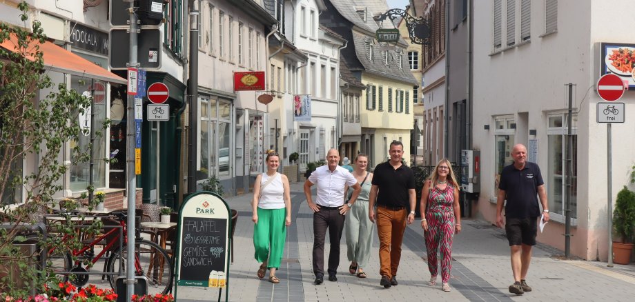 Großes Foto: Stellten die neue Mühlenstraße im Rahmen eines Pressetermins vor (v.l.): Julia Jänig (Projektleitung Abteilung Stadtplanung und Umwelt), Ordnungsdezernent Markus Schlosser, Julia Besler (stellv. Leitung Stadtbauamt), OB Emanuel Letz, Nicole Aumer (Leitung Abteilung Verkehrsangelegenheiten), Michael Pollok (Projektleitung Abteilung Tiefbau und Grünflächen). Fotos: Isabel Gemperlein