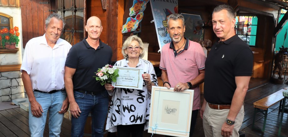 Foto (v.l.): Ralf Leonhard, Vorsitzender Schaustelleverband Bad Kreuznach, Jahrmarktsbürgermeister Markus Schlosser, Schausteller-Jubilarin Hedwig Kaufmann-Nagel, Marktmeister Mathias Weyand, OB Emanuel Letz. Foto: Isabel Gemperlein