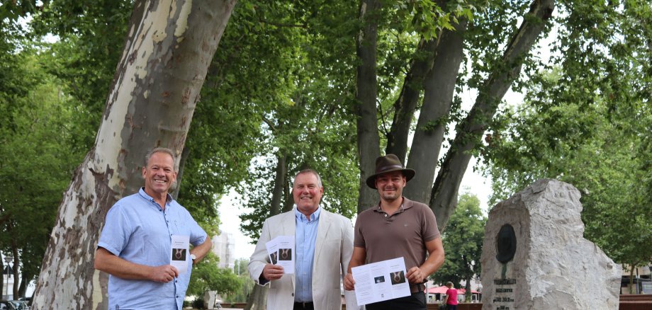 Foto: Ein schattiges Plätzchen unter den mächtigen Platanen in der Kurhausstraße: Markus Foos, Thomas Blechschmidt und Alexander Merz (von links) werben um Baumspenden. Foto: Hansjörg Rehbein