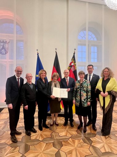 Sein ehrenamtliches Schaffen zeichne sich durch eine große Vielfalt und eine hohe Nachhaltigkeit aus. Besonders hervor hob die Ministerpräsidentin sein Engagement für den Erhalt und die Förderung von jüdischer Kultur in Bad Kreuznach und der Region. Seit fast 40 Jahren unterstütze er die Synagoge Meisenheim, und durch seinen Einsatz entstand auch das vielbeachtete Glaskunstwerk „Symchat Tora“ in der Synagoge Bad Kreuznach. Werner Fuchs habe wichtige historische und künstlerische Ausstellungen und große jüdische Intellektuelle in die Region gebracht und damit Türen für gedankliche und persönliche Begegnungen geöffnet. Darüber hinaus seien die Eheleute Fuchs seit Jahrzehnten engagierte Gastgeber für Besucher und Besucherinnen aus der israelischen Partnerstadt Kirjat Motzkin, so die Ministerpräsidentin.