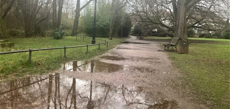 Großes Foto: Pfützen im Schlossparks von Bad Kreuznach. Aufgrund von starken Winden und aufgeweichten Böden empfiehlt die Stadt Parkanlagen mit hohen Bäumen zu meiden. Foto: Isabel Gemperlein