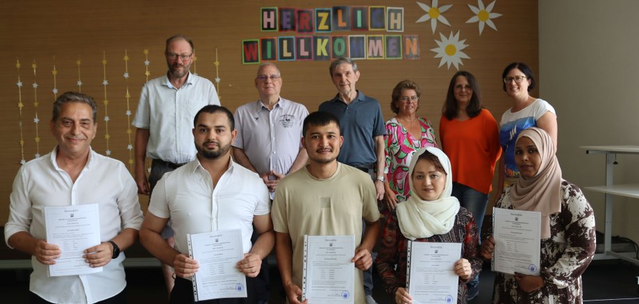 Foto: In der ersten Reihe von links nach rechts: Vasileios Patsilas, Walid Behruz, Mohamad Jafar Karimi, Aliya Jafari, Nora Hassan Osman. In der zweiten Reihe von links nach rechts: Othmar Heim (Dozent Erdkunde und Geschichte), Martin Springorum (Dozent Deutsch), Helmut Wolf (Dozent Mathematik), Tanja Cremer (Geschäftsführerin vhs), Angelika Jost (Verwaltung vhs), Christina Schneider (2. Konrektorin der Crucenia Realschule plus). Nicht auf dem Foto: Marina Maltry, Lucius Lysander Fuhrmann, Xhenita Haliti. Foto: Hansjörg Rehbein