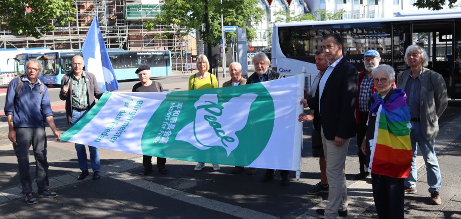 Foto: Mit Aktivistinnen und Aktivisten der Friedensbewegung hisste OB Emanuel Letz (4.v.r.) die Flagge "Mayor for Peace"