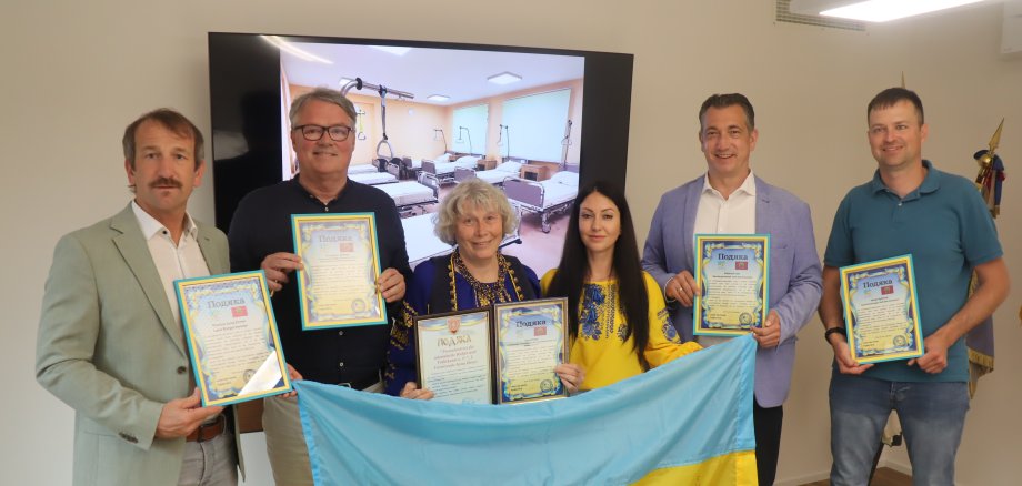 Foto: Oksana Yarkina (3.v.r.) kam aus Saporischschja, um sich für die große Klinikspende bei Oberbürgermeister Emanuel Letz (2.v.r.) und Hansjörg Rehbein (2.v.l.) zu bedanken. Begleitet wurde sie von Thomas Jung (links), Iryna Denys und Denis Ribuic (rechts). Foto: Isabel Gemperlein