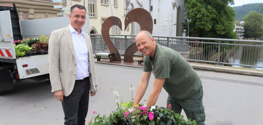Foto: Freuen sich über die frischen Blumen auf der Mühlenteichbrücke: OB Emanuel Letz und Andreas Foos vom Bauhof. Text und Foto: Hansjörg Rehbein