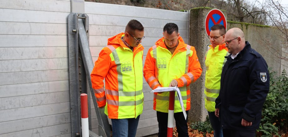Foto: Den Hochwasseralarmplan studierte Oberbürgermeister Emanuel Letz (2.v.l.) mit Sebastian Kunz (links, Hochwasserschutz in der Abteilung Tiefbau und Grünflächen), Philipp Geib (Leiter Abteilung Tiefbau und Grünflächen) und Michael Seibel (rechts, hauptamtlicher Leiter Feuerwehr) bei einem Ortstermin im Dezember 2023. Archivfoto: Hansjörg Rehbein