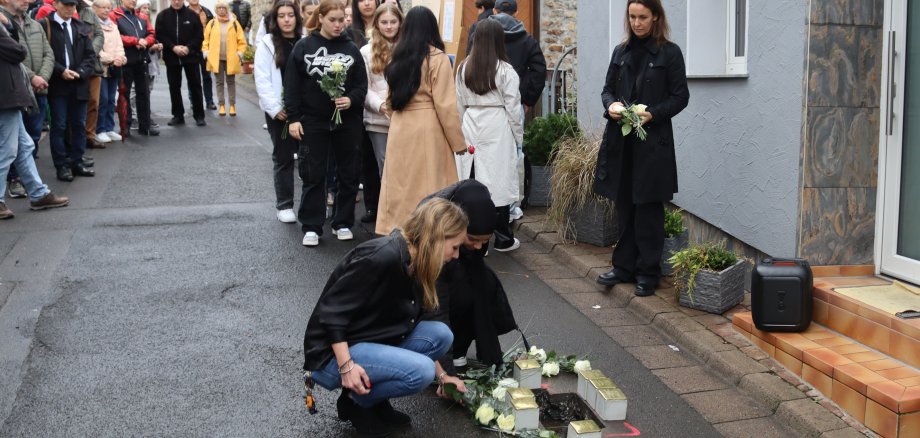 Foto: Schülerinnen und Schüler der IGS Sophie Sondhelm schilderten das Schicksal der Ebernburger NS-Opfer und legten anschließend mit ihren Lehrerinnen Tina Engelberger (rechts) und Angelina Braun (kniend) weiße Rosen an den Stolpersteinen nieder. Foto: Hansjörg Rehbein