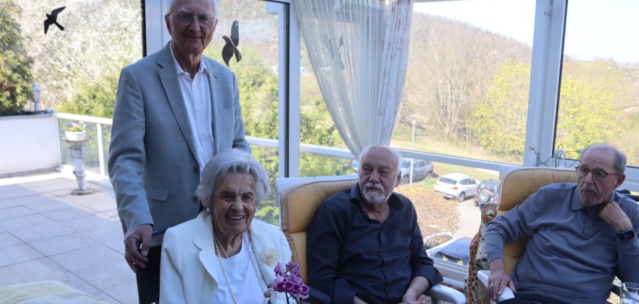 Foto oben: Blumenfreundin Doris Eckel freute sich sehr über die Orchideen. Zu den Gratulanten zum 100. Geburtstag gehörten ihr Betreuer Rüdiger Brunk (stehend), Dr. Klaus Kordmann und Lorenz Fischer (rechts).