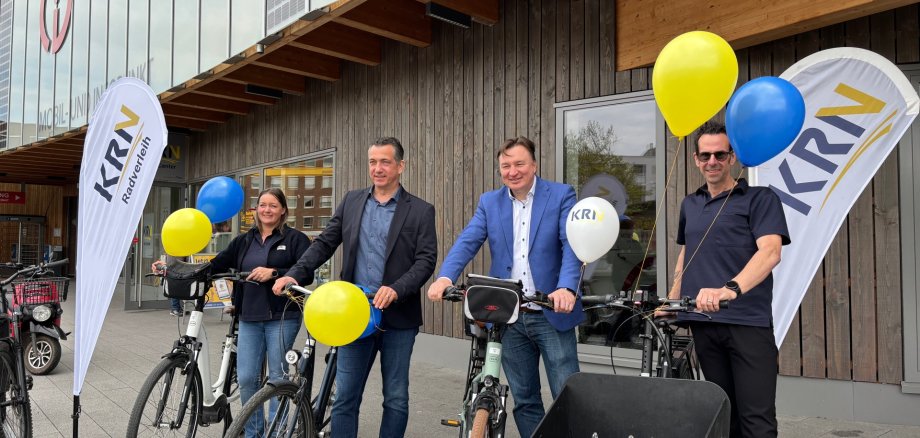Großes Foto: Oberbürgermeister Emanuel Letz (2.v.l.) und KRN-Geschäftsführer Uwe Hiltmann (2.v.r.) nehmen den Fahrradverleih gemeinsam mit den KRN-Mitarbeitenden Swana Schlich und Patrick Louis in Betrieb. Foto: KRN/Julia Stanger