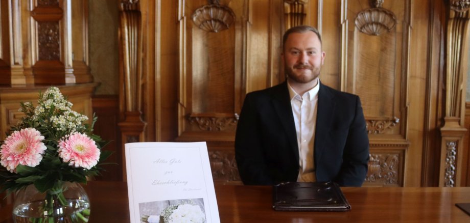 Foto: Schon mal Probe sitzen im Jagdzimmer des Schloßparkmuseums. Doch erst 2026 wird der neue Standesbeamte Sammy Probsdorfer sein erstes Paar dort trauen. Für dieses Jahr sind dort schon alle Termine vergeben.