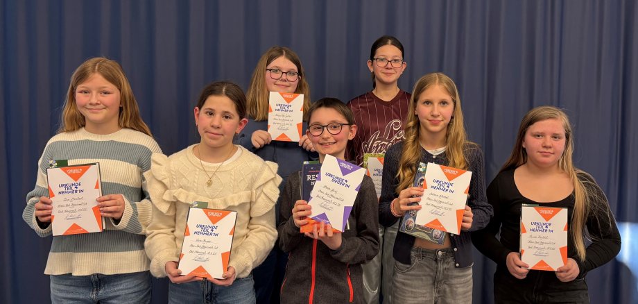 Foto (v.l.): Ronja Petra Gohres, Sanarah Merkelbach (hinten), Liva Marchert, Lara Kasper, Henri Lang, Antonia Scherbel und Sanaz Sünbül (vorne)