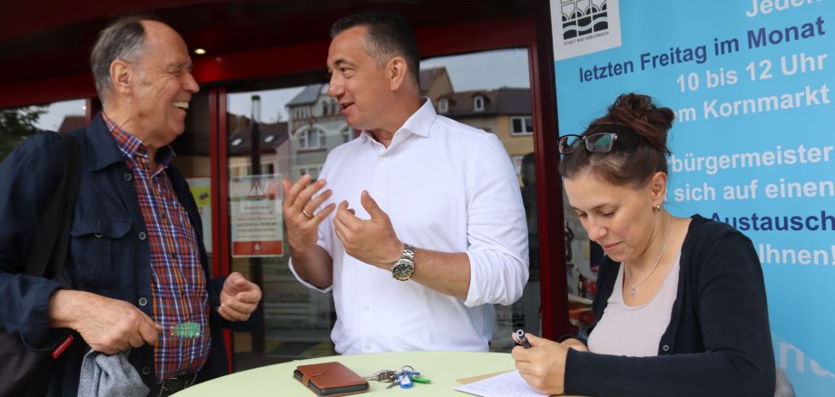 Foto: Wann wird der Weg in der Naheweinstraße gemacht? Bernd Ottersbach im Gespräch mit Oberbürgermeister Emanuel Letz. Mitarbeiterin Lisa Weller notierte alle Wünsche, Anregungen, Kritiken und Beschwerden. Foto: Hansjörg Rehbein