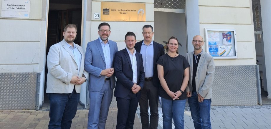 Foto (v.l.): Stefan Thoma (Angeordneter), Philipp Fernis (Minister für Justiz), Steven Wink (Fraktionsvorsitzender), OB Emanuel Letz, Vanessa Berg (Leiterin Jugendzentrum „Die Mühle“), Stefan Reithofer (stellv. Leiter Amt für Kinder und Jugend). Foto: Isabel Gemperlein