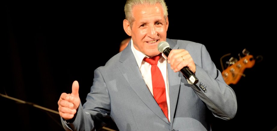 Foto: Django H. Reinhardts Stimme begeisterte beim Benefizkonzert für den Kinderschutzbund die über 300 Gäste im Großen Kursaal. Der Koblenzer Musiker freute sich über den hohen Veranstaltungserlös. Foto: Charlotte Eberwien