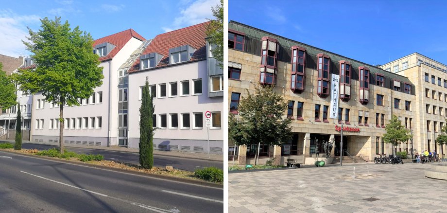 Foto: Ab 18. Juni ziehen die Bürgerdienste (Einwohnermeldeamt, Kfz-Zulassungsstelle, Führerscheinstelle und sonstige Verkehrsangelegenheiten) vom Brückes 2-8 (links) ins Rathaus am Kornmarkt 5 (rechts). Fotos: Isabel Gemperlein