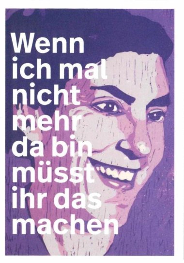 Das letzte Wort gehörte der Bildhauerin Gudrun Schuster, städtische Kunstpreisträgerin des Jahres 2005. Wer Hildegard Schäfers Vermächtnis lesen will, muss sich bewegen, das heißt muss den Stein umrunden. Denn auf dem 1,50 Meter hohen und fünf Tonnen schweren Udelfinger Sandsteinblock liegt ein 30 Zentimeter hoher Sandsteinblock mit der von ihr selbst entwickelten Schreibschrift mit dem Satz „wenn ich nicht mehr bin müsst ihr das machen“. Der Stein symbolisiert die dicken Mauern eines Gefängnisses. In ihn ist ein kleines Guckloch gemeißelt, das die Botschaft „es gibt immer Hoffnung auf einen Ausweg“ vermitteln soll.