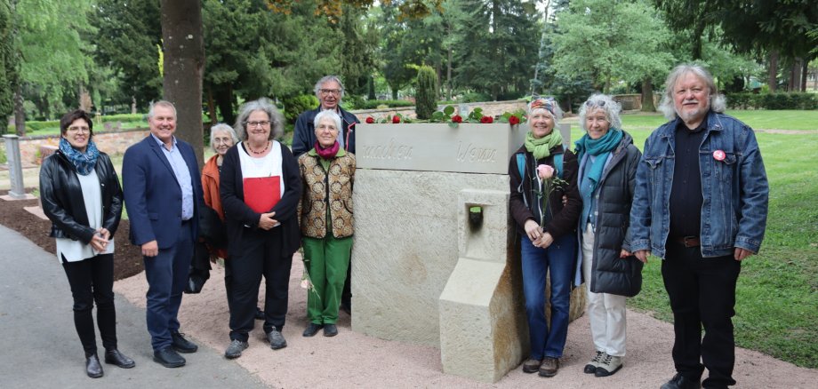 Foto: Zum Erinnerungsfoto stellten sich die Beteiligten um den Gedenkstein, u.a. Bürgermeister Thomas Blechschmidt (2.v.l.) und die Künstlerin Gudrun Schuster (rechts am Stein stehend). Foto: Hansjörg Rehbein