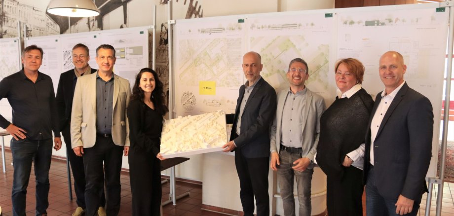 Foto: Die Sieger des Wettbewerbs für den Grundschulneubau im Bösgrunder Weg präsentieren den Entwurf im Rathaus. Mit dabei u.a.: OB Emanuel Letz, Schuldezernent Markus Schlosser, Schulamtsleitern Grit Gigga und Bauamtsleiter Eduard Schuckmann. Foto: Hansjörg Rehbein