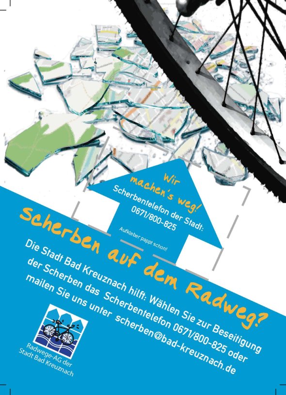 Und plötzlich ist die Luft raus. Scherben auf dem Radweg können die Fahrt zum Arbeitsplatz oder die Tour ins Grüne zum Ärgernis machen. „Wir machen´s weg“, heißt da der Slogan auf einer Postkarte, mit der die Stadt ihr Scherbentelefon für die Radwege im Stadtgebiet ankündigt.