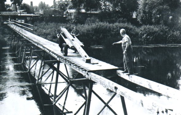 Jedes Einzelteil der Brücke wurde von Nikolaus Quack selbst angefertigt und zu Elementen wie Böcken, Laufbahnen und Geländern zusammengefügt. Die Komponenten waren durchnummeriert und die Reihenfolge musste beim Aufbau exakt eingehalten werden. Zwischen den „Festtagen“ wurden die Brückenelemente auf dem Grundstück an der Schlachthofstraße gelagert.