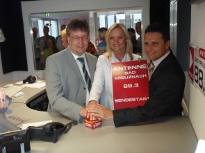 6. Juni: Oberbürgermeister Ludwig drückt Startknopf für Antenne Bad Kreuznach. Pünktlich um 6.06 Uhr ist es dann soweit. Das jüngste Kind in der großen Bad Kreuznacher Medienfamilie war geboren. Mit den beiden Geschäftsführern von Antenne Bad Kreuznach, Doreen Gesierich und Stephan Schwenk, drückte auch Oberbürgermeister Andreas Ludwig den roten Knopf und gab damit den Sendebetrieb für das Radio Bad Kreuznach frei. „Das Radio ist eine große Bereicherung für die Region“, freut sich der OB auf viele schöne Stunden Information und Musik aus dem Studio in der Kreuzstraße.