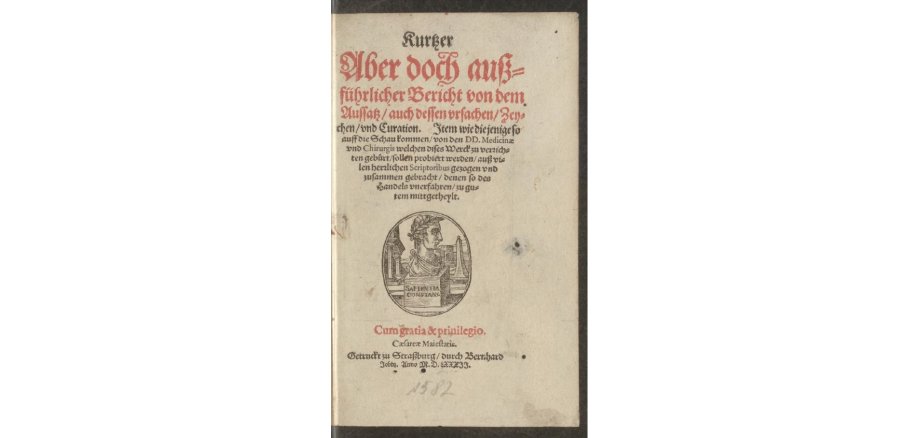 Aus: Philipp Schopff: Kurtzer Aber doch außführlicher Bericht von dem Aussatz auch dessen vrsachen Zeychen und Curation Item wie die jenige so auff die Schau kommen von den DD. Medicinae vnd Chirurgis welchen dises Werck zu verrichten gebürt sollen probiert werden auß vilen herzlichen Scriptoribus gezogen vnd zusammen gebracht denen so des Handels vnerfahren zu gutem mittgetheylt, Straßburg, [gedruckt bei] Bernhard Jobin, 1582 [HWZB, Sign. M69]