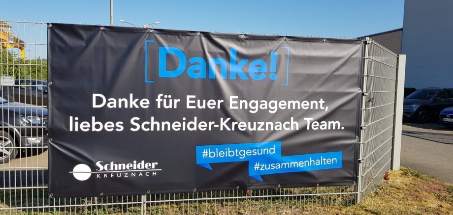 Die Einschränkungen zum Schutz vor dem Corona-Virus ist auch für die Menschen in Handel, Gewerbe, Dienstleistung und Industrie eine große Belastung. Hier zwei Beispiele, wie sich Unternehmen bei ihren Mitarbeiterinnen und Mitarbeitern bedanken. So hat Schneider Kreuznach Banner auf dem Werksgelände anbringen lassen. Die Firma Michelin gibt "Ihrer Familie oder guten Freunden" die Gelegenheit "beispielsweise unseren MICHELIN CrossClimate+ für ganzjährig sorgloses Fahren zu sichern. Je Gutscheincode erhalten Sie oder Ihre Liebsten auf bis zu vier beliebige MICHELIN PKW-Reifen", heißt es in einer Firmenmitteilung.