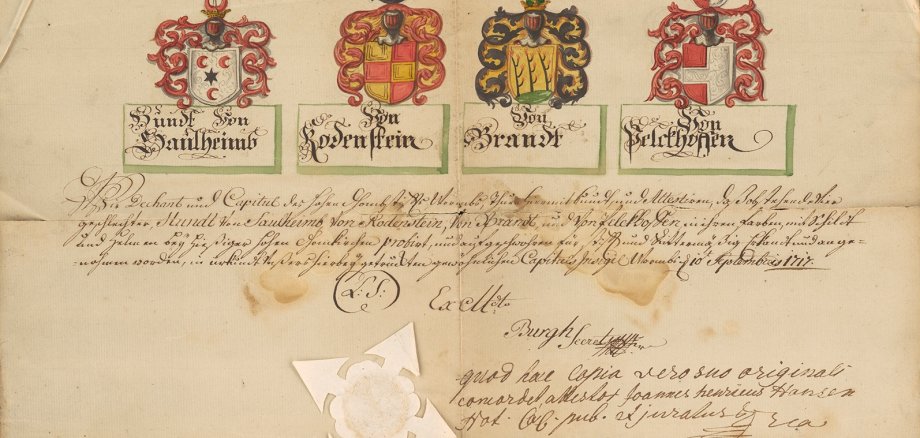 Die 1717 in Worms ausgestellte Kopie eines Attestats ist Teil einer kleinen Sammlung des Stadtarchivs Bad Kreuznach. Darauf sind die Wappen der Adelsfamilien Hund von Saulheim, von Rodenstein, von Brandt und von Pelckhofen zu erkennen. Helm, Helmzier, Helmdecken, Schild sowie Helmkrone (Hundt von Saulheim/von Brand) und Kissen (von Rodenstein) wurden per Hand mit stark leuchtenden Tinkturen auf Hadernpapier aufgetragen. Die Farbgebung der Wappen, die sogenannte Tingierung, bringt den gewünschten Kontrastreichtum zum Ausdruck, der ursprünglich für ein schnelles Erkennen von heraldischen Zeichen notwendig war. Im Folgenden ist der Inhalt des Attestats wörtliche widergegeben: