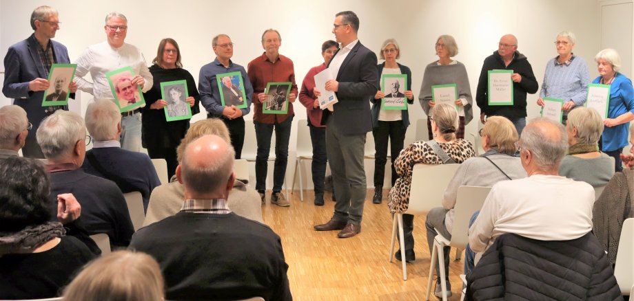 Foto: Mit einer Sonderausgabe „wir erinnern an“ mit Vorträgen, Gesprächen, Biografien und Bildern bedankte sich Oberbürgermeister Emanuel Letz bei den Vortragenden der Kurzbiografien: Andreas Mohs, Hansjörg Rehbein, Franziska Blum-Gabelmann, Andreas Duhrmann, Ulrich Eymann, Britta Lehna, Waltraut Collet. Anna Meyer, Karl-Ernst Laubenstein, Irene Dilly und Marianne Natzinger (v.l.). Foto: Sarah Förster
