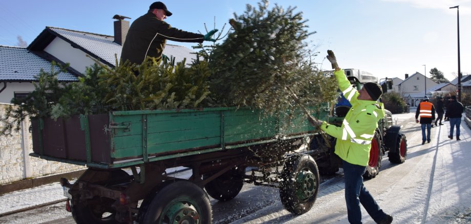 Nachdem die aktuell gültigen Corona-Regeln überprüft und die Touren eingeteilt waren, machten sich die drei Traktoren mit ihren Mannschaften und je einer Versorgungskiste mit belegten Brötchen und Getränken auf den Weg. Nach etwas mehr als vier Stunden waren alle Bäume eingesammelt und ins Kompostwerk gebracht. Im Unterschied zu den Vorjahren fiel auf, dass mehr Bäume zusammenkamen, insbesondere mehr große Exemplare. Vielleicht hatte es sich mancher in den eigenen vier Wänden zur Weihnachtszeit besonders festlich gemacht.