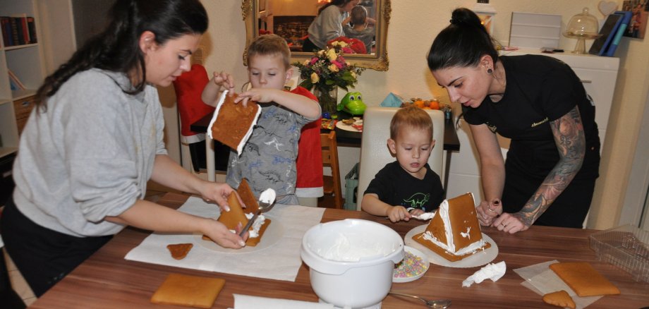 Foto von links: Elena, Leo, Romeo und Larissa beim Basteln von Lebkuchenhäuschen