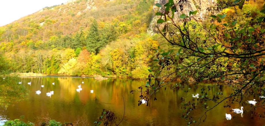 Besonders schön ist die Natur jetzt, da sie sich mit bunten Herbstfarben schmückt. Das sieht man bei einer Fahrt entlang der Naheweinberge in Richtung Idar-Oberstein oder bei einem Spaziergang entlang der Nahe in Bad Münster, wo seit mehreren Monaten ungefähr 30 Schwäne ihre Bahnen ziehen.